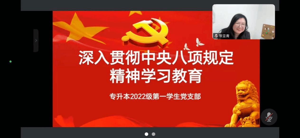 为深入贯彻落实党的二十大精神,持续深化作风建设,beat365在线唯一官网专升本2022级第一学生党支部于3月28日组织全体党员开展深入贯彻中央八项规定精神学习教育活动。