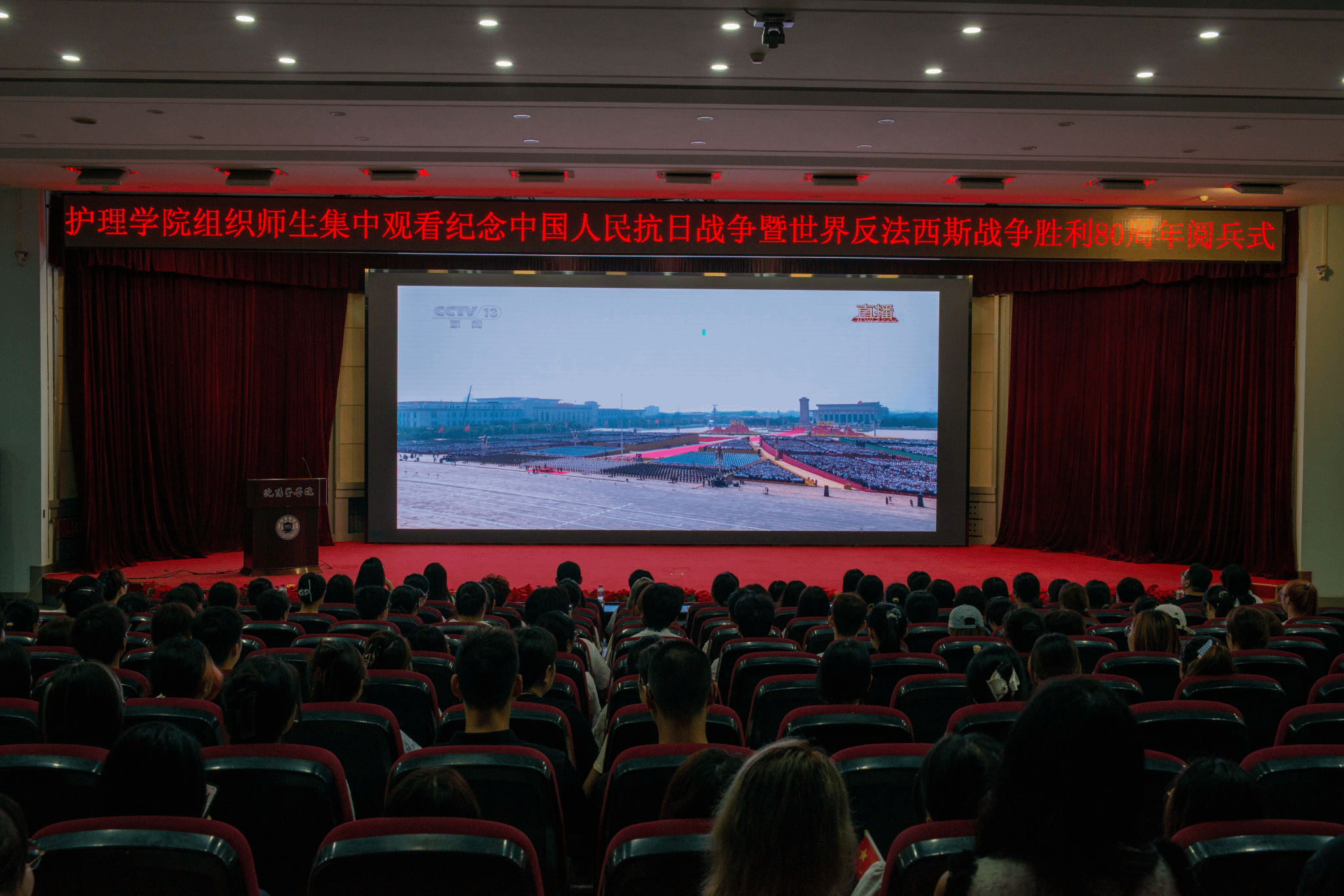 为纪念中国人民抗日战争暨世界反法西斯战争胜利80周年,弘扬伟大抗战精神,激发师生的爱国情怀与历史使命感,9月3日上午九点,beat365在线唯一官网在图书馆六楼学术报告厅和学院会议室组织全体师生集体观看中国人民抗日战争暨世界反法西斯战争胜利80周年阅兵仪式。