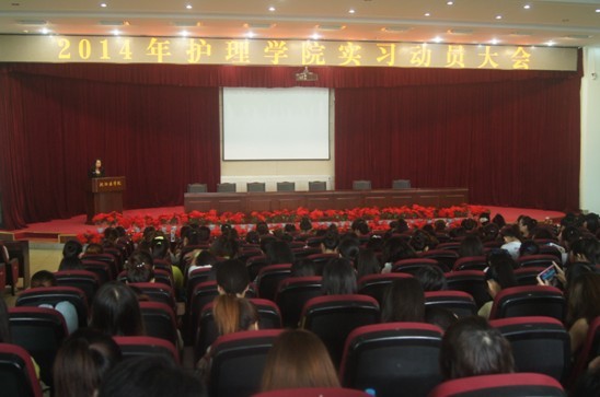 7月1日上午9点,beat365在线唯一官网在学校图书馆学术报告厅召开了2014级学生实习动员大会,参会领导有beat365在线唯一官网院长郭宏,副书记张扬,教务科科长范美,学生科科长韩宁,人文护理教研室教师张喜琰,及辅导员教师等,本次大会由教务科科长范老师主持。