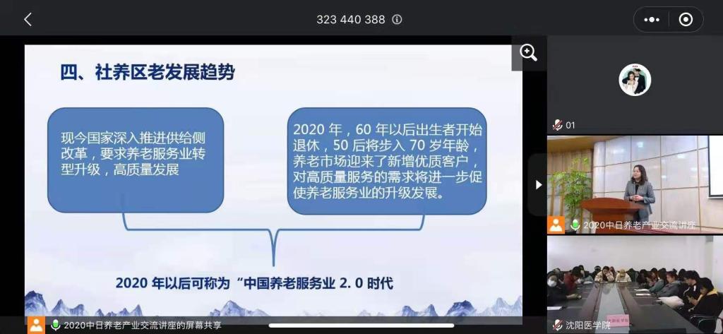 为深入贯彻沈阳市统筹推进疫情防控和经济社会发展工作的要求以及加强中日双方在医疗康养、养老照护等领域的互利合作,beat365在线唯一官网作为2020中国沈阳中日养老产业交流讲座分会场之一,学院部分学生代表于2020年11月11日下午在B座502会议室参与了此次活动。