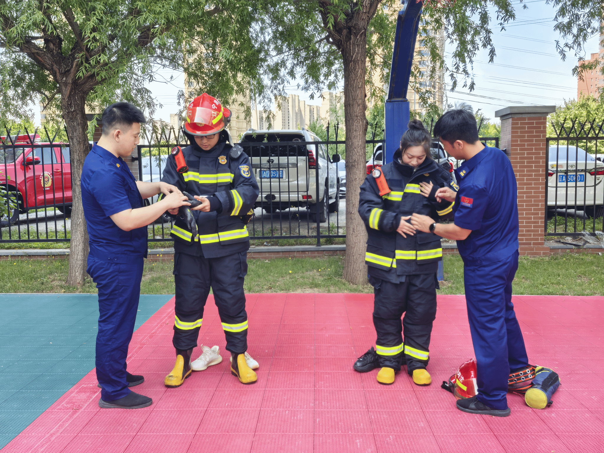 在消防员的带领下,师生们参观了消防站的宿舍及训练场地。整洁划一的宿舍内务、摆放有序的救援装备,让学生们深刻感受到消防队伍的严谨作风。消防员现场演示了消防服的快速穿戴技巧,并邀请学生试穿体验。厚重的防护服、密闭的呼吸面罩让学生们直呼“不易”,纷纷感叹消防员在高温、浓烟环境下的艰辛与奉献。