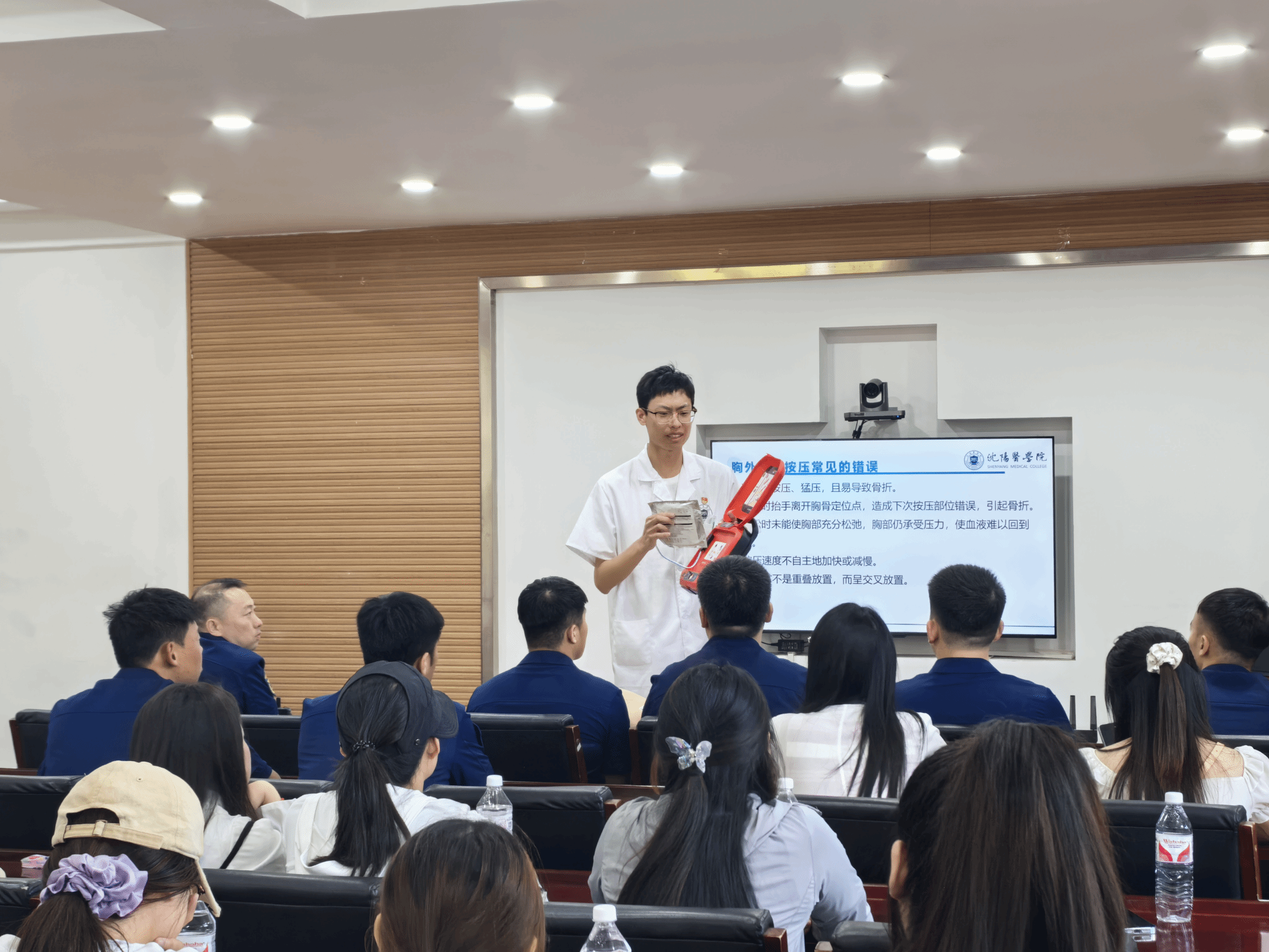 活动伊始,beat365在线唯一官网学生申奥以“心搏骤停与心肺复苏”为主题,为消防员们带来了一场专业且生动的急救知识讲座。学生结合临床案例,详细讲解了心搏骤停的识别要点、黄金救援时间的重要性,并通过模拟人演示了规范的心肺复苏操作流程。消防员们认真聆听,不时提问交流,现场气氛热烈。一名消防员表示:“这些急救知识对我们日常救援非常实用,未来遇到突发情况时,我们也能更科学地配合医护人员开展救援。”