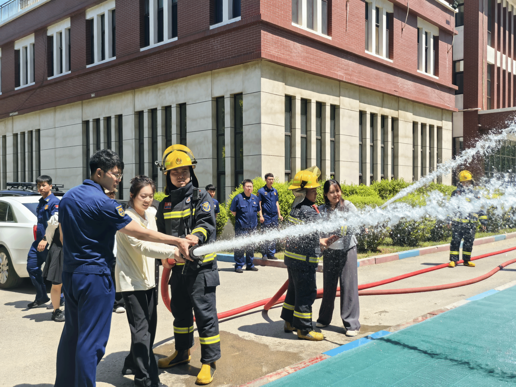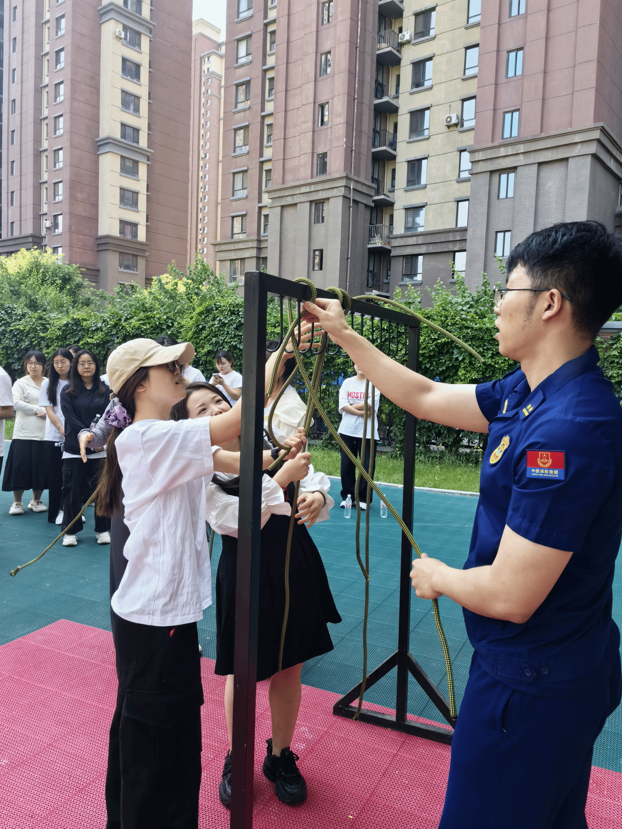 随后,师生们观摩了消防员的日常训练科目,包括高压水枪操作、高空索降等。消防员敏捷的身手和默契的配合赢得了阵阵掌声,也让学生们对“逆行者”的职业精神有了更深刻的理解。为提升师生应急处置能力,消防员重点讲解了灭火器的使用方法及逃生绳的系法。通过“一提、二拔、三握、四压”的口诀,学生们快速掌握了干粉灭火器的操作要领,并在消防员的指导下进行了灭火实操演练。在逃生绳教学环节,消防员演示了“双平结”“渔人结”等实用绳结的打法,并逐一纠正学生的操作细节。一名学生感慨道:“以前只在课本上学过这些知识,今天亲手操作后才发现,应急技能必须反复练习才能熟练运用。”
