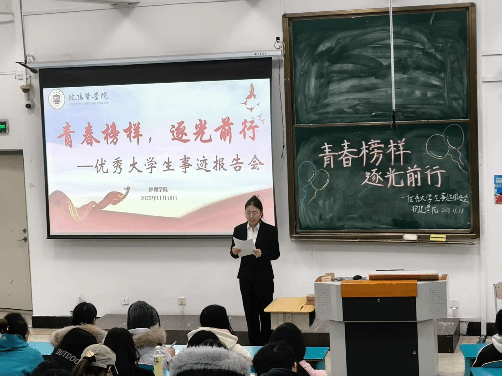 报告会开始,25级护理专升本5班李艾佳作为主持人率先登场,围绕本次活动开展的目的与进程做了简单的介绍。她既是串联环节的“桥梁”,也是带动情绪的“氛围组组长”,用幽默风趣的表达拉近距离,用真诚热忱的互动调动热情,让每一位观众都能沉浸其中,感受活动的气氛与温度。