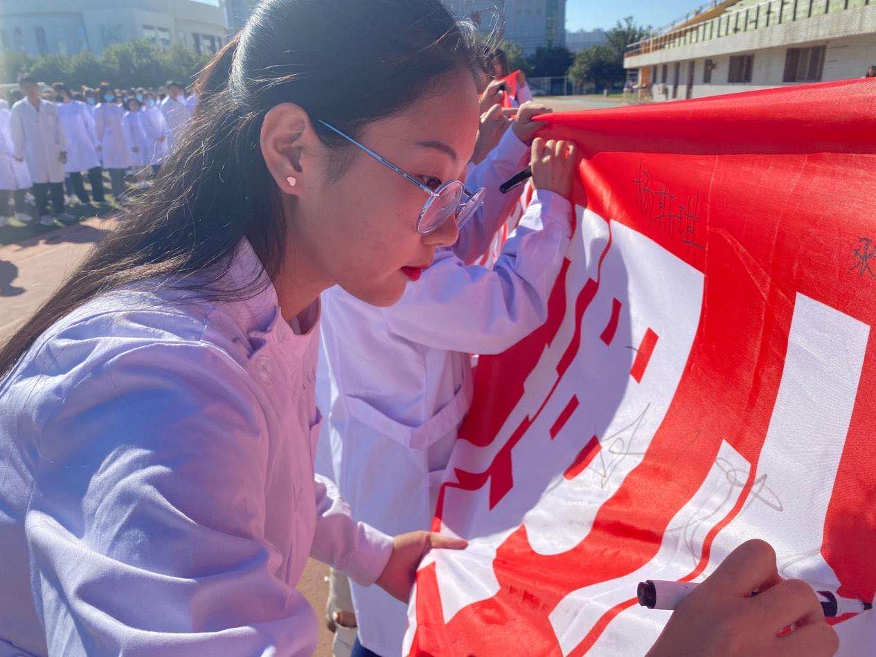 最后,默哀结束,各班学生代表在横幅上郑重签字。同学们满怀爱国热情,用行动向祖国承诺,知史勿忘国耻,铭志振兴中华,一个个签名,不仅代表了未来白衣天使们的热血,还代表了beat365在线唯一官网全体师生对祖国的承诺。