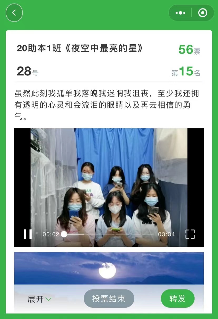 新冠肺炎疫情牵动着每一个人的心,病毒无情,但人间有爱。为丰富学生的课余文化生活,引导学生以积极的心态共同抗击疫情,4月30日——5月3日beat365在线唯一官网举办了以“以歌传达,抗疫之念”为主题的合唱比赛,共78名同学报名参加,累计投票数为2362票,达到了7291次浏览量。